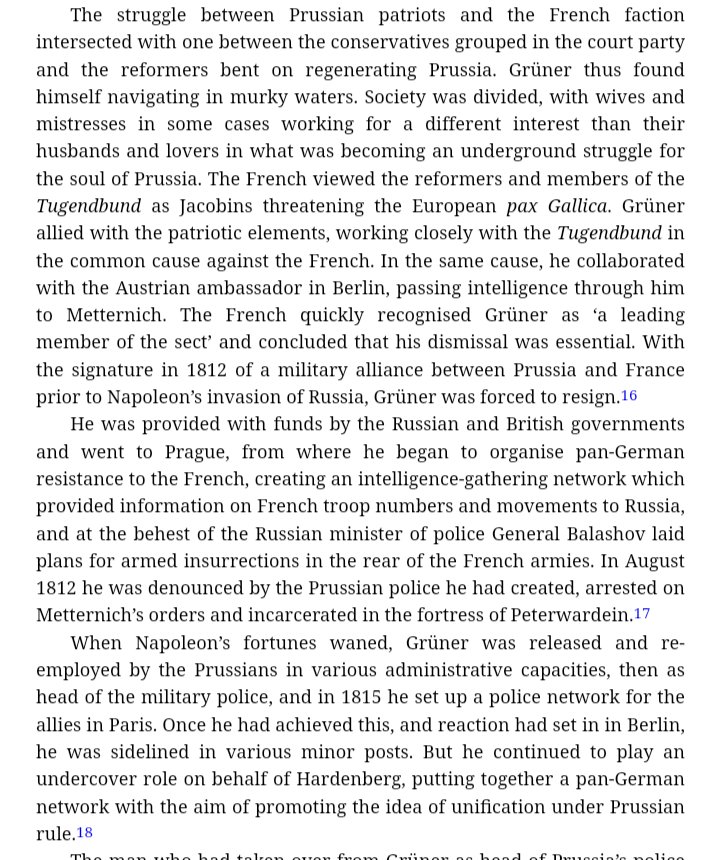 After its defeat and subjugation by Napoleon, Prussia became a hotbed of espionage. When the young Prussian civil servant in charge of the secret police was forced out by the French, the allies helped him organize and run a pan-German underground network.