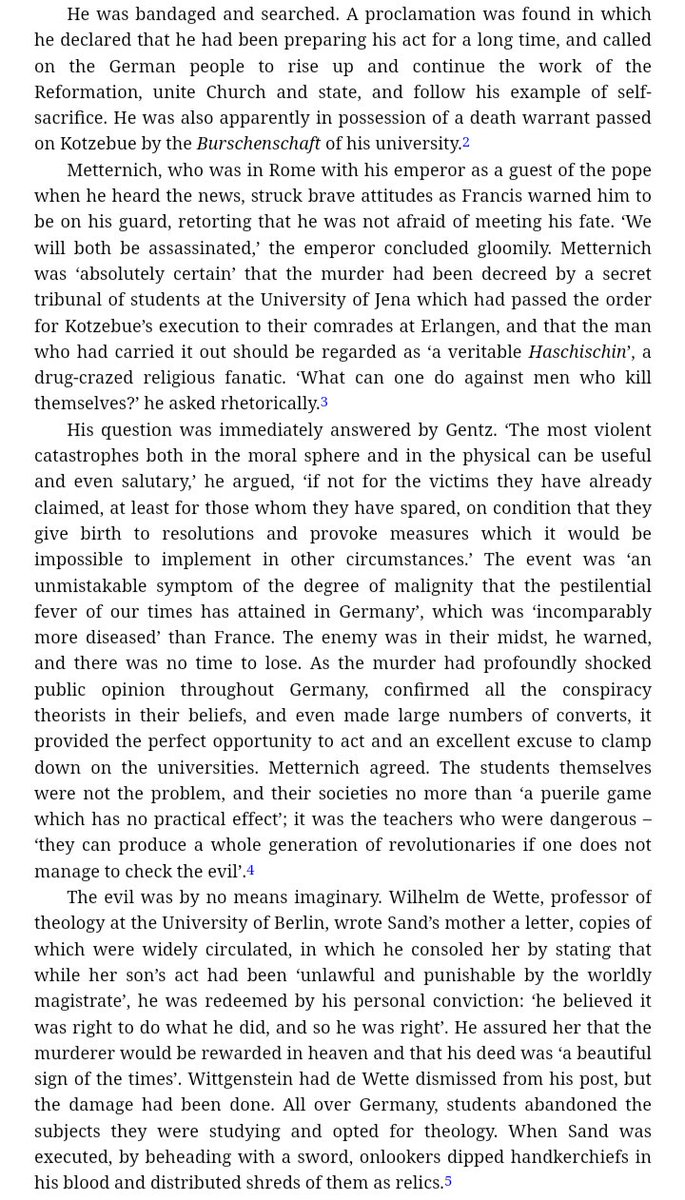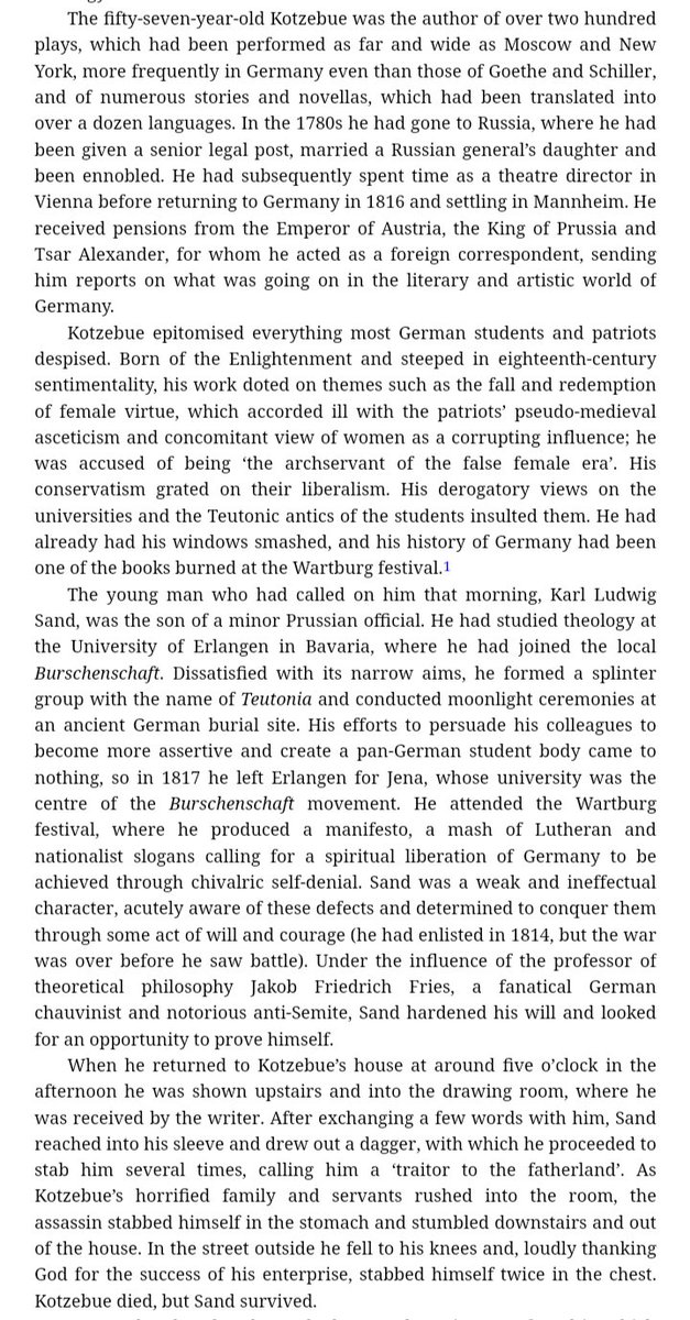 A German student and hardcore nationalist stabbed a conservative playwright to death and then attempted to kill himself. It seemed to confirm all of Metternich's conspiracy theories and justified a crackdown on universities.