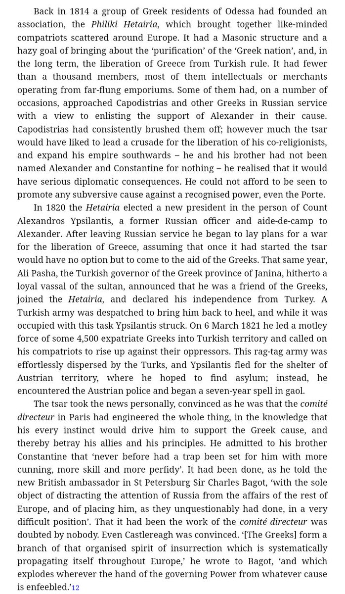 When the Greek Revolution kicked off, Tsar Alexander became convinced it was a plot to stage a liberal revolution in an Orthodox country, which he would be naturally support, splitting him from his conservative allies.