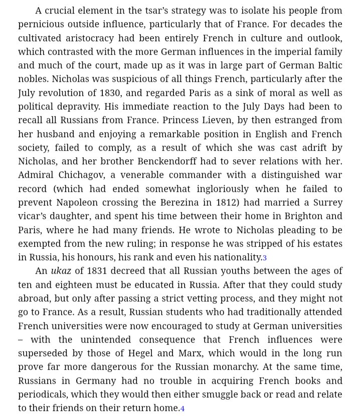 Tsar Nicholas attempted to stamp out subversion by preventing Russians especially students, from going to France. This had the unfortunate side effect of ensuring that Russian intellectuals read Germans like Marx and Hegel instead.