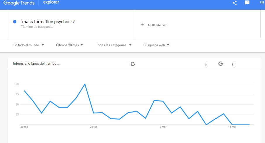 El 2 de enero de 2022, la psicosis de formación de masas alcanzó un valor de 100 en Google Trends, lo que significa que había alcanzado su máxima popularidad, después de que antes era prácticamente desconocida. trends.google.com/trends/explore…