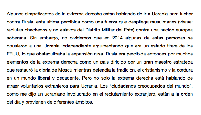 Entre los voluntarios, los neonazis «no buscan defender Ucrania, sociedad multiétnica y de mentalidad democrática dirigida por un presidente judío. Ven esta guerra como un lugar para representar sus fantasías violentas o comparten la visión de un estado étnico ultranacionalista».