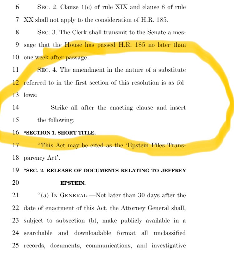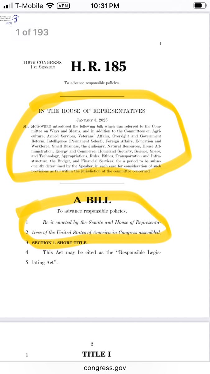 /3 Here is a link to the full 193 pages of HR 185. (Zzzz). Note the 23 committees listed and the enactment clause in the image below. Massie’s proposed amendment would substitute 4 pages of Epstein disclosure requirements for all 192 pages of HR 185 after the enactment clause, thereby circumventing 23 committees’ work on dozens of issues (for better or worse). congress.gov/119/bills/hr18…