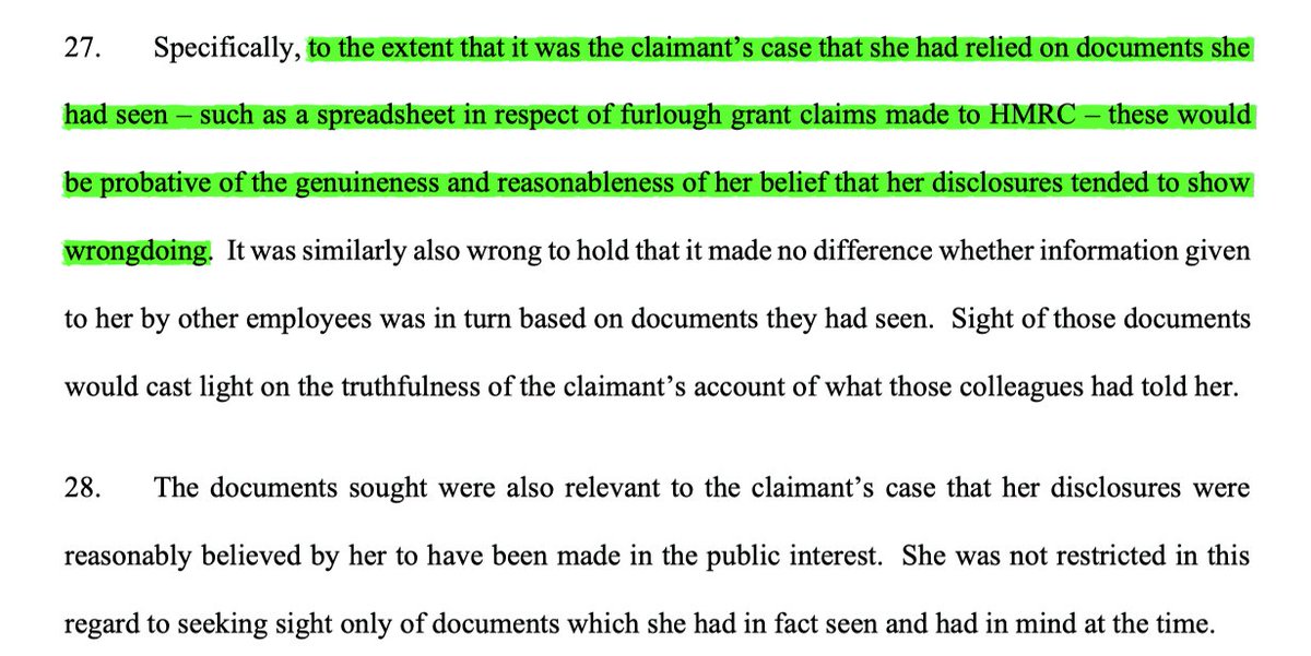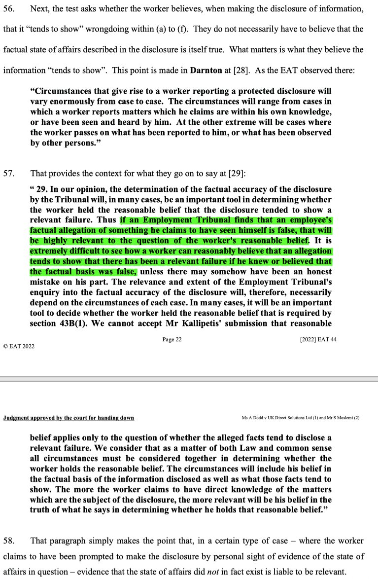 9/ Darnton, the EAT explained, makes the point that where a worker claims to have made the PD prompted by personal sight of evidence underlying it, then evidence that that state of affairs didn't exist will be of relevance.