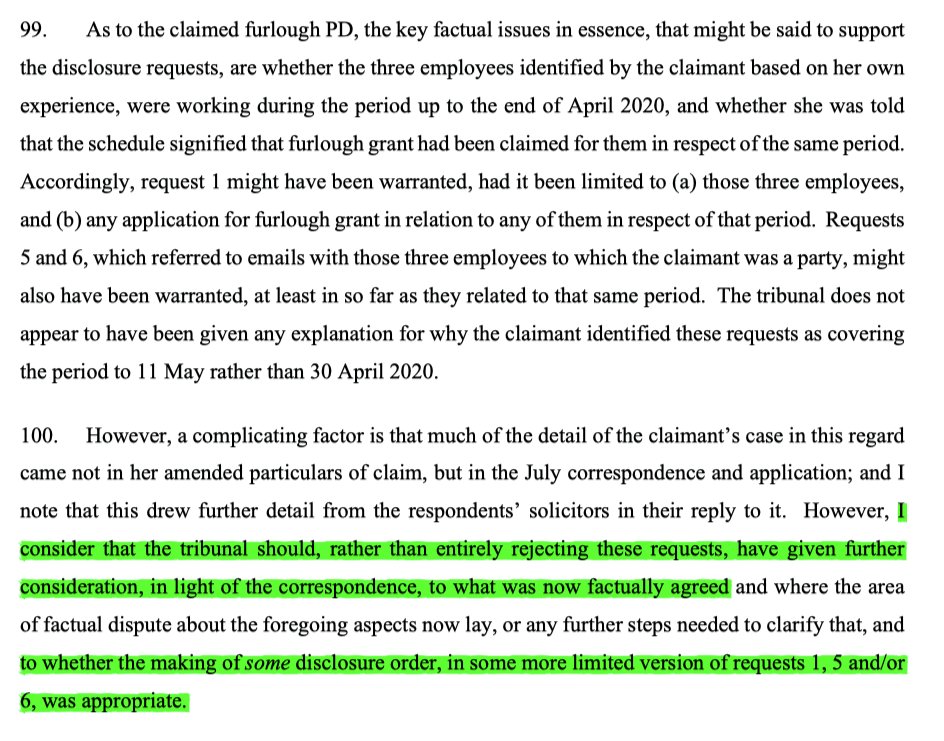 13/ The appeal was only allowed to a very limited extent to remit for redetermination of disclosure of docs concerned with whether 3 named employees were working in April 2020 & were under furlough at the time. Other than that all grounds were dismissed.