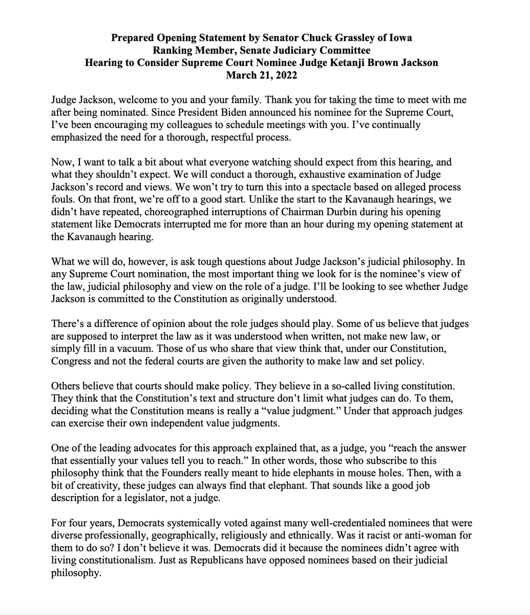 Here is Republican Ranking Member Chuck Grassley's full opening statement. He says, "We won't try to turn this into a spectacle based on alleged process fouls" and then throws a low blow by accusing Democrats of over-interrupting him during Kavanaugh. 9/ judiciary.senate.gov/imo/media/doc/…