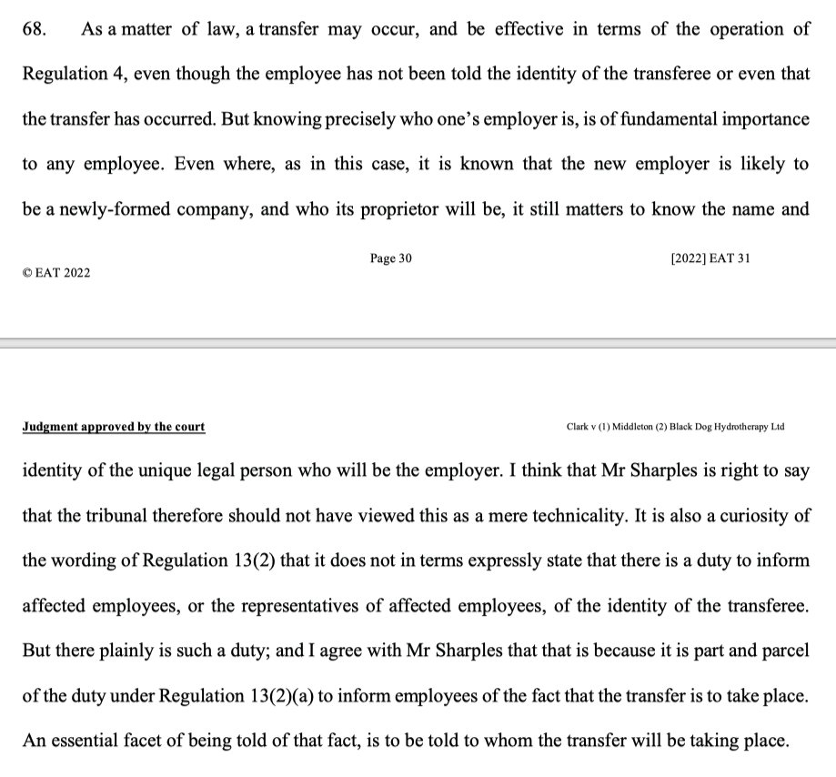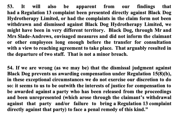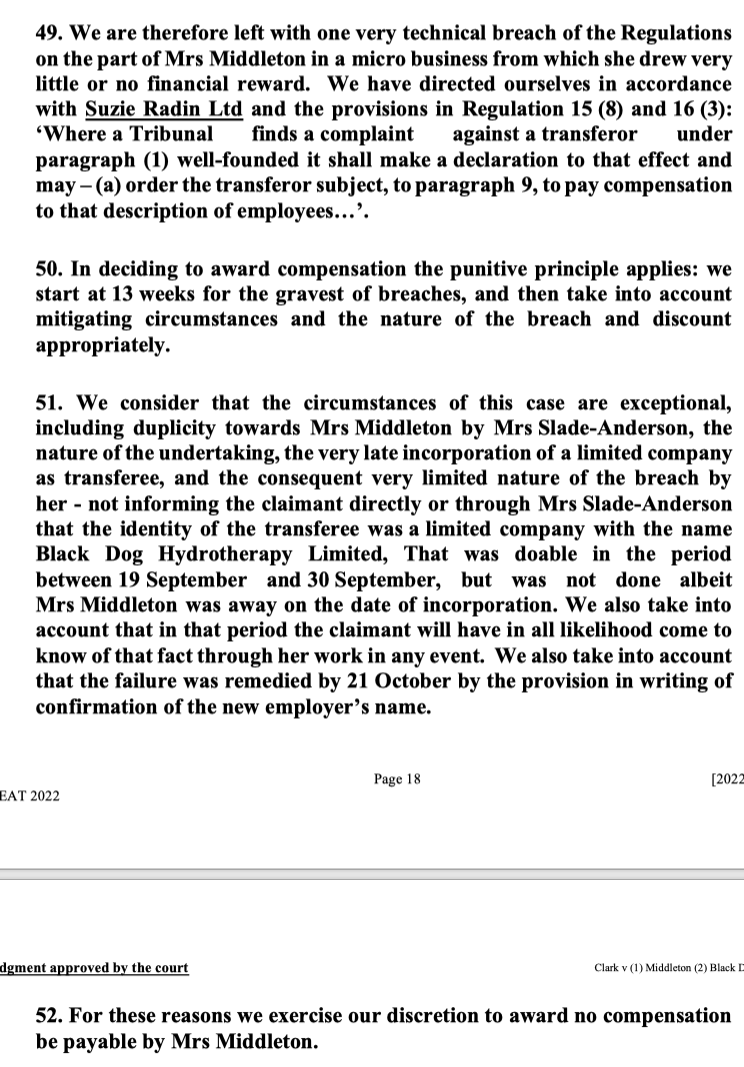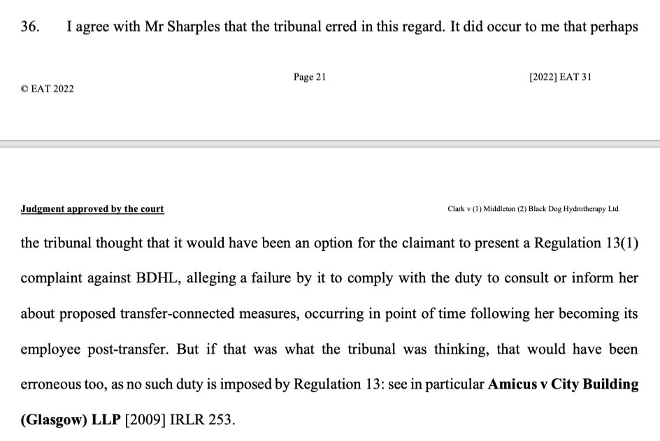 1/Clark v Middleton & Black Dog Hydrotherapy Ltd: EAT holds it's possible to settle a transferee's TUPE Reg 15(8)(b) consultation liability, & a failure to inform on the t'ee's identity isn't a technicality for which £0 compensation is justified. bailii.org/uk/cases/UKEAT…#ukemplaw
