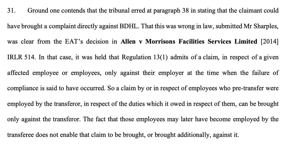 11/ On appeal, the EAT found the ET wrong to find C erred in solely bringing the Reg 13 claim against M rather than BDHL. The claim was to be brought against the party who was the employer at the point of breach of compliance, & with the duty to consult that was the t'or.