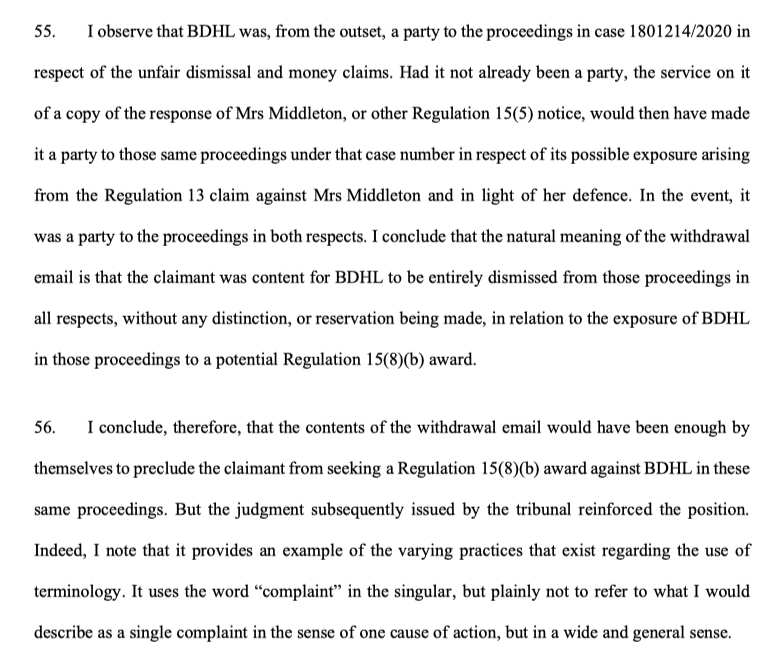 12/ The next question was whether the ET then erred in finding the settlement & dismissal on withdrawal of C's other claims against BDHL meant that an order under reg 15(8)(b) for it to pay the compensation couldn't be made.