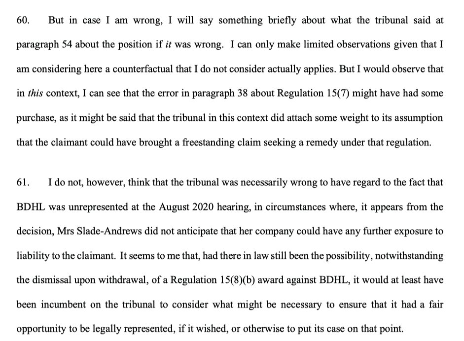 15/ Even if wrong on that, the EAT accepted the legitimacy of the ET's counterfactual position in para 54 of the ET judgment that it could note that BDHL wasn't represented at the hearing & didn't anticipate that it would have further exposure to liability to C after settlement.