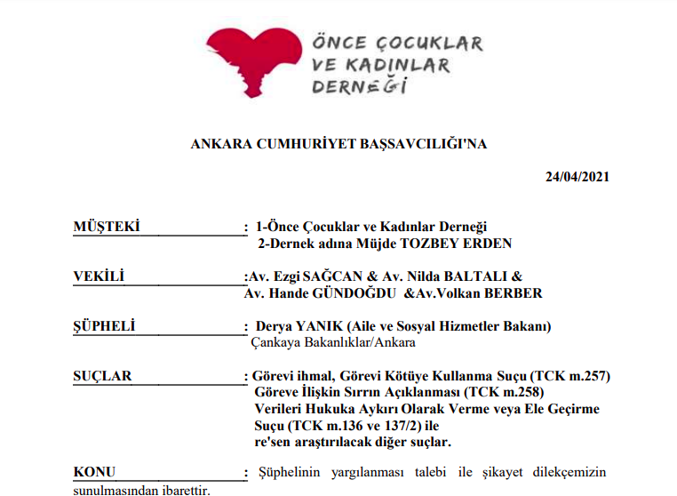 kamuoyuyla paylamış, çocuğun gizlilik hakkını ihlal etmiştir. Bakanın işbu eylemleri nedeniyle Önce Çocuklar ve Kadınlar Derneği adına suç duyurusunda bulunma
