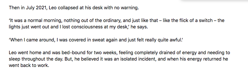 Th usual story here, in good healthy, young etc, catches Covid has a rough time of it—hospital fobbed him off despite the fact he couldn't breathe—his first blackout started when he had Covid in March 2020: