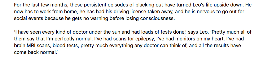 ‘The concerning thing for me is how long it takes for me to recover after I have an episode,’ says Leo. ‘It’s not like I black out and then feel fine in an hour, I get groggy and drained and severely exhausted for weeks.'