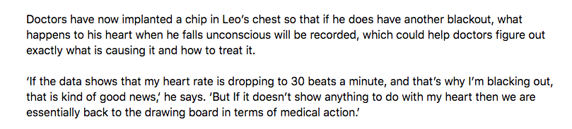 Drs trying to work out what's causing the blackouts so they put a chip in his heart: