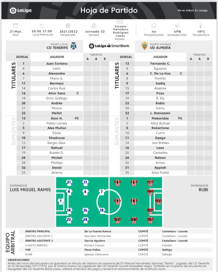 Dirigirá el partido el vallisoletano De la Fuente Ramos, designación que ha generado polémica tanto en Tenerife como en Almería en días atrás. Asistido en el VAR por el gallego Pérez Pallas.