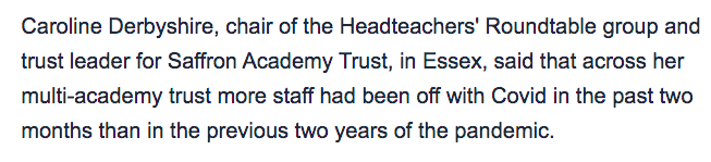 'Caroline Derbyshire, chair of the Headteachers' Roundtable group and trust leader for Saffron Academy Trust, in Essex, said that across her multi-academy trust more staff had been off with Covid in the past two months than in the previous two years of the pandemic.'