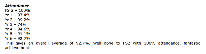 The attendance awards showed that 26% of year 3 were absent during the week—but the school nonetheless has retained high attendance in other year groups: something which this head seems to think is fantastic: making sure that all the children...