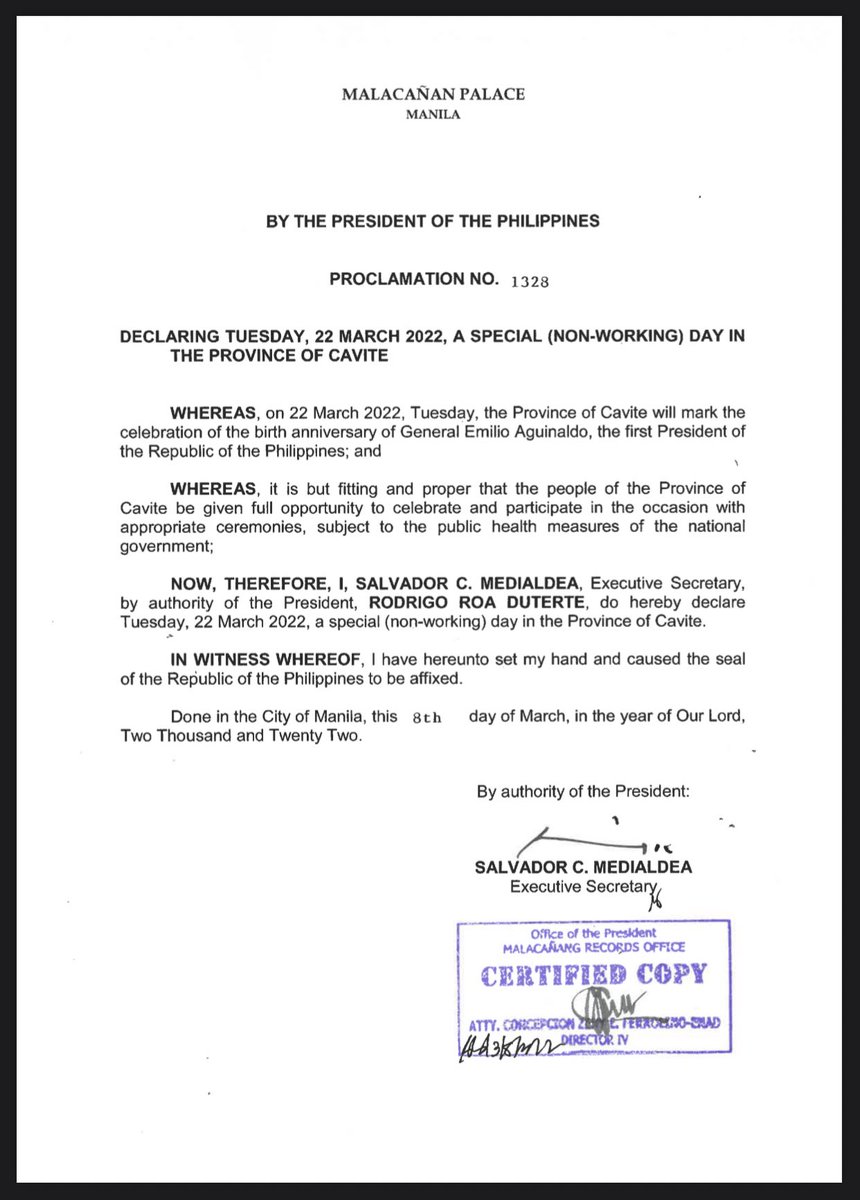 Marcos and Duterte's Cavite sortie, to culminate in a grand rally in Gen Trias Sports Complex later, coincides with Cavite Day, a special non-working holiday for Caviteños