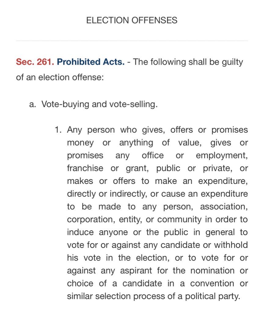 Section 261 of the Omnibus Election Code prohibits “any person who gives, offers or promises money or anything of value... in order to induce anyone or the public in general to vote for or against any candidate."