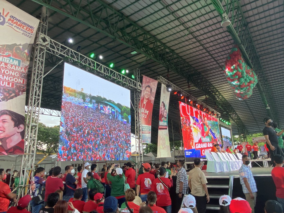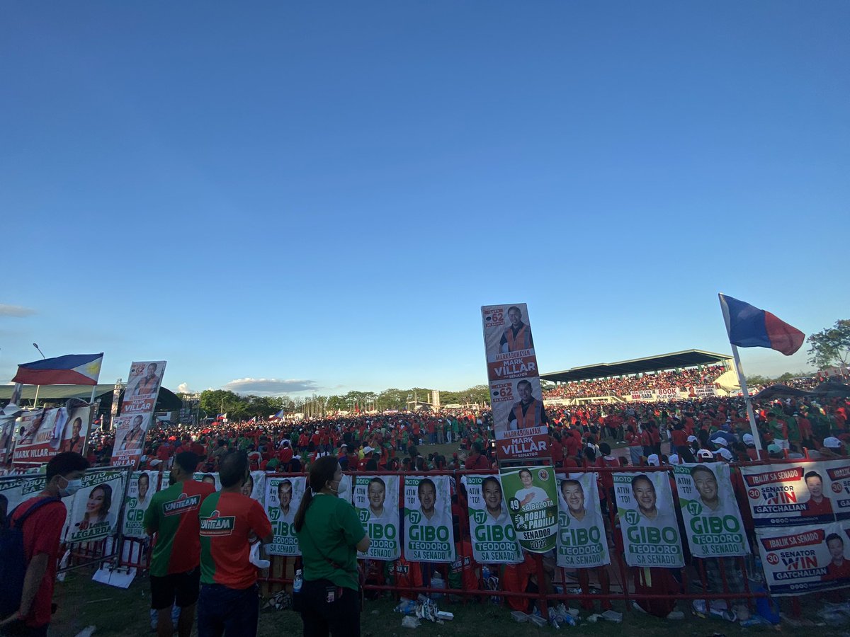 Hard to tweet here from Gen Trias Sports Complex, but massive crowd already here ahead of Marcos and Duterte. Comedian Bayani Agbayani was entertaining crowd before senatorial bets. I've seen 6 people who passed out.