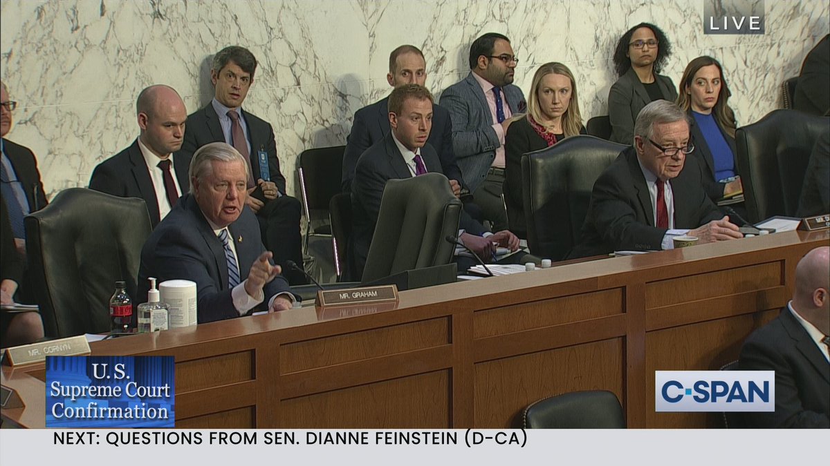 Durbin right out of the gate wants to address the ongoing "issues" surrounding her "judicial philosophy"-says no one questions her credentials or education - he reminds the committee that she has over 500 written opinions and thousands of pages of published text. 3/