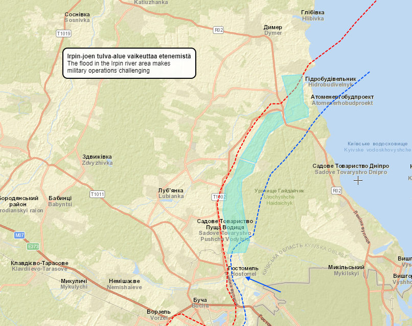 Hostomelin pohjoispuolen tilanteesta täytyy ymmärtää Irpin-joen tulva-alueen merkitys. Merkityn alueen kautta on hyvin haastavaa edetä mihinkään, sillä mm. patojen avaaminen, pumppujen tuhoutuminen ja vuodenaika on muuttanut alueen hyvin vetiseksi sekä mutaiseksi. 4/