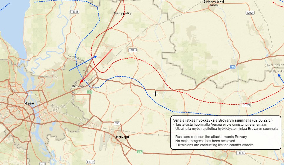 Eilisillan ja yön tietojen perusteella molemmat osapuolet olisivat toteuttaneet pienehköjä hyökkäyksiä Brovaryn ulkopuolella. Tämän iltapäivän ilmoitusten perusteella kumpikaan osapuoli ei ole edennyt, ja hyökkäykset ovat ilmeisesti loppuneet. 9/