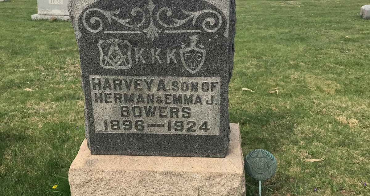 Harvey here also has a Freemasons symbol. During this time fraternal societies were at the height of their popularity in the U.S. and the Second Ku Klux Klan was directly patterned after them, so it's not surprising.