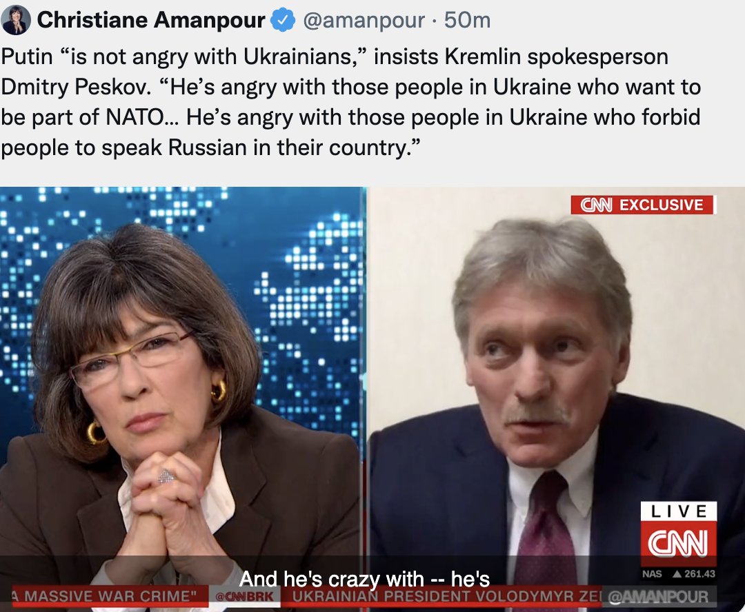 🤭@amanpour got Kremlin spox Peskov to admit Putin is very angry. Including abt “Russian speakers not able to speak Russian in Ukraine.” This is a lie & more demonstrably false now. We hear victims of Russian bombs in Mariupol & Kharkiv tell their horror stories in Russian daily!