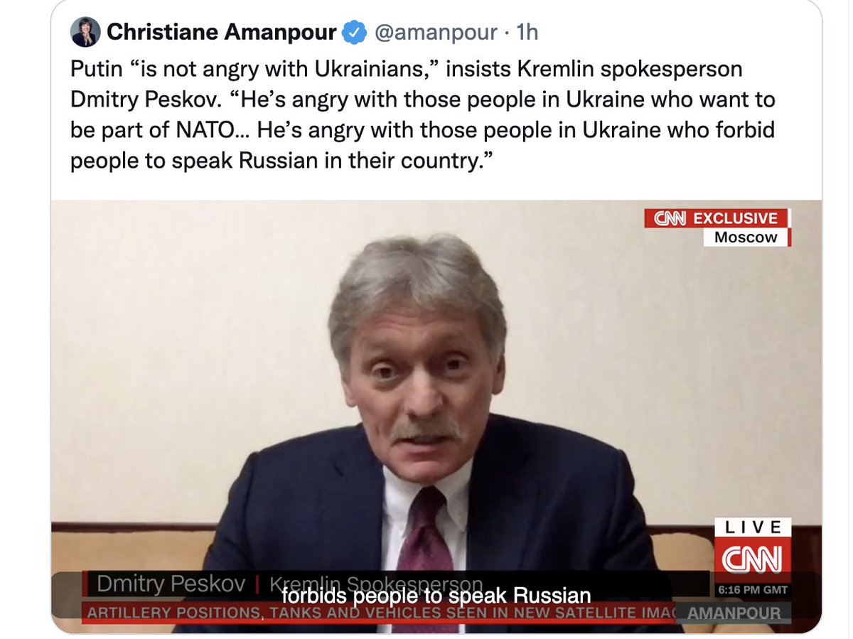 @amanpour 🤨Peskov claimed Putin isn't angry with Ukrainians—"no one in Russia is angry w/ Ukrainians"—then listed all the Ukrainians Putin's angry with. Here's the quote on the Russian language/"Russian World" lie: