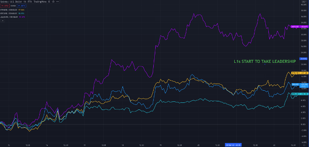 3/ ETH finally waking up as ETH/BTC breaks above downtrend and L1s take the baton this week. AVAX leads the way ahead of Barcelona Summit.