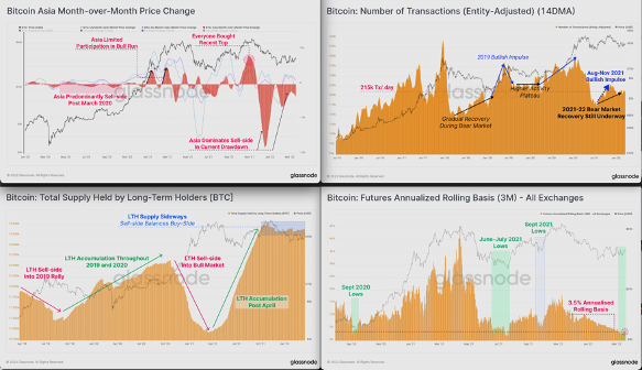 Asia prominent on the sell side since late last year, Transaction count stable but not rising, LTH balances relatively high so less liquid supply if beta chase kicks in, Quarterly futures basis very low suggests are people well hedged