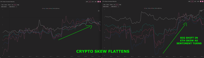 8/ Skew flattened back sharply, especially in ETH which had been the favoured protection asset. This type of shift in skew can often lead a move as sentiment shifts.