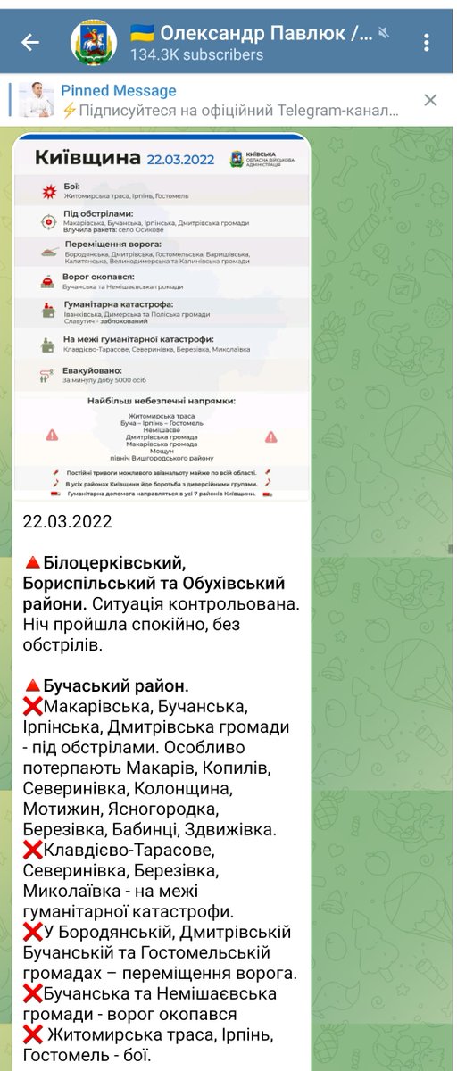 Tämän päivän viimeisimpien tietojen mukaan keskeisimmät taistelut käydään E40-valtatien alueella, Irpinissä ja Hostomelissa. Voi siis teoriassa olla, että Ukraina on edennyt valtatiellä jo karttaa pidemmälle. Ukrainalla on ilmeisesti tahtotila saada ura auki jälleen. 3/