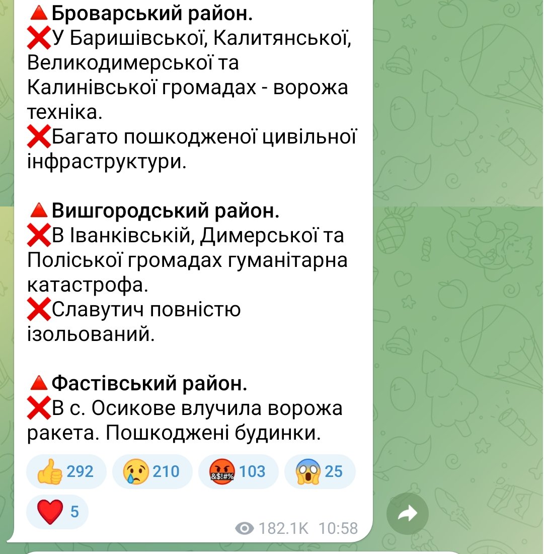 Yhden mahdollisen viitteen löysimme. Eräässä Kiovan alueen tiedotus-Telegramissa mainitaan muiden asioiden ohella klo 10:58, että Babyntsin ja Zdvizhivkan kylät kärsivät tulituksesta.