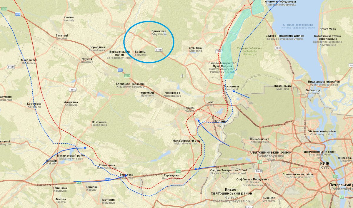 Ukraina on edennyt Makarivin suunnalla sekä taistellut Irpin-Bucha-Hostomel-akselilla. Twitterin OSINT-viitteiden ja kuvien perusteella taisteluja on käyty myös Berezivkassa asti.