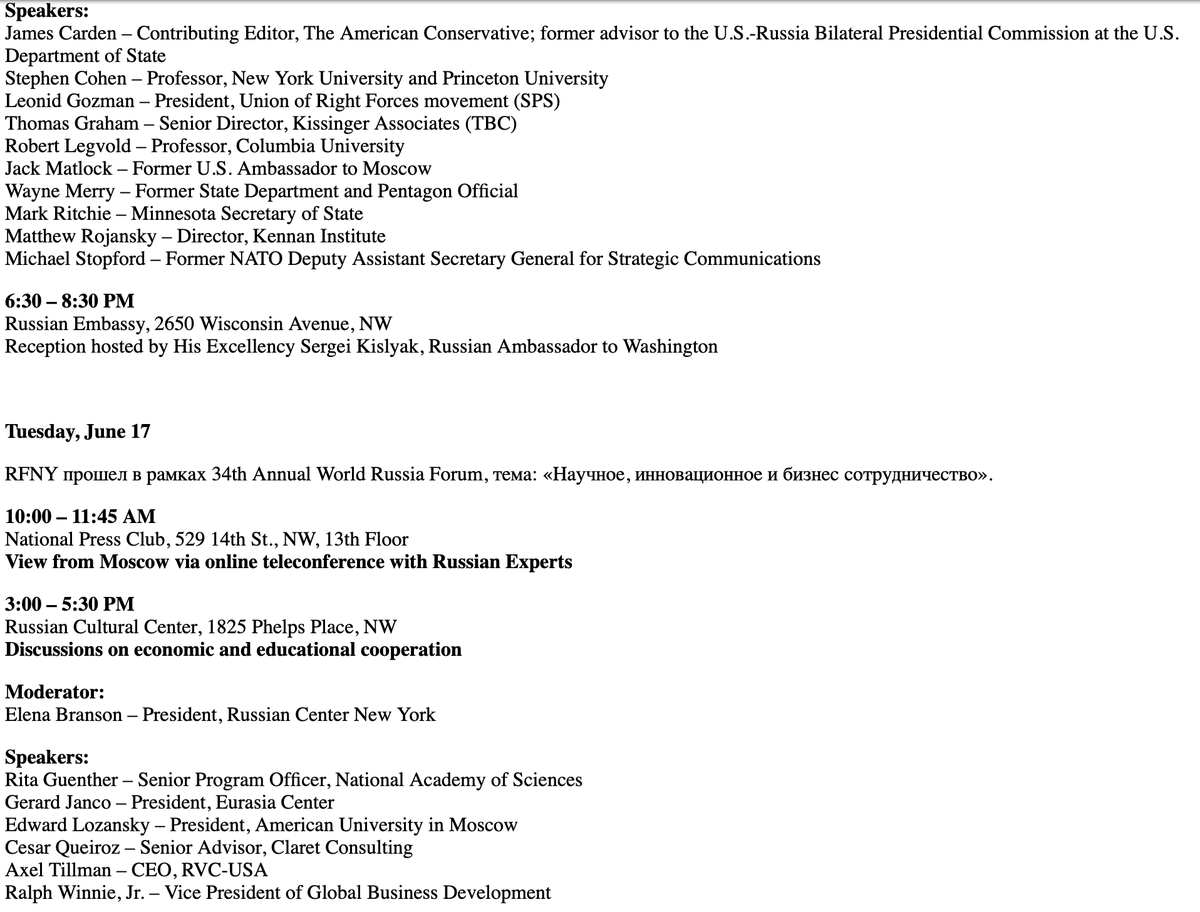 If I go back one more year to 2014, I find that the World Russia Forum and the Russia Forum NY seem to be united, with Cohen and American Conservative guy James Carden and fmr ambassador Jack Matlock (both also with the ACEWA), along with Branson and Lozansky of KSORS. /12