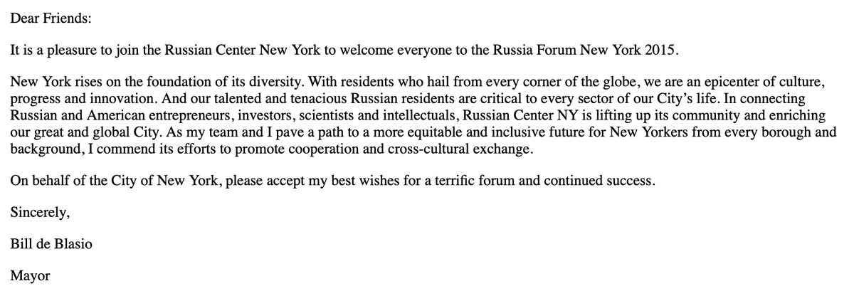 In 2013, Mayor Bloomberg said RFNY "offers an excellent opportunity to examine the state of U.S.-Russia relations, and to discuss how business leaders from both countries can best work together for the benefit of our common interests.” De Blasio in 2015 was even nicer (below) /14