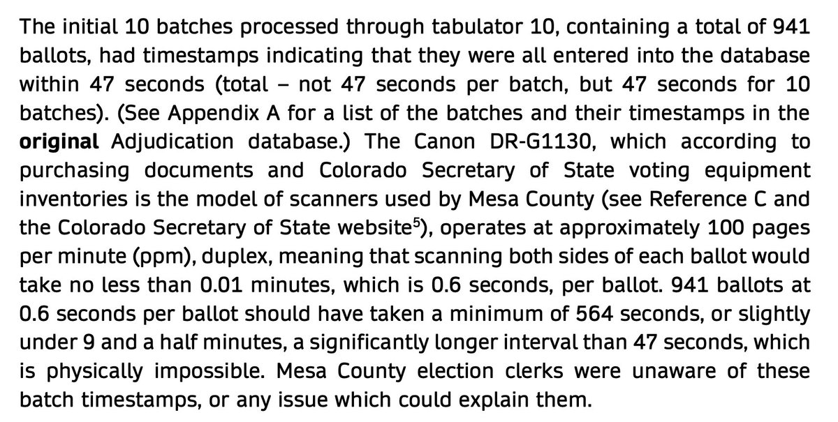 10 batches of ballots recorded as scanned in 47 seconds, “which is physically impossible.”