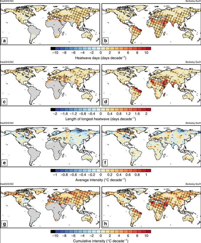 6/ Pero lo que sí es indicativo es un incremento en el número, duración e intensidad de las olas de calor a nivel global. Perkins-Kirkpatrick & Lewis (2020) demostraron que estos tres parámetros habían aumentado a escala global entre 1950 y 2014.