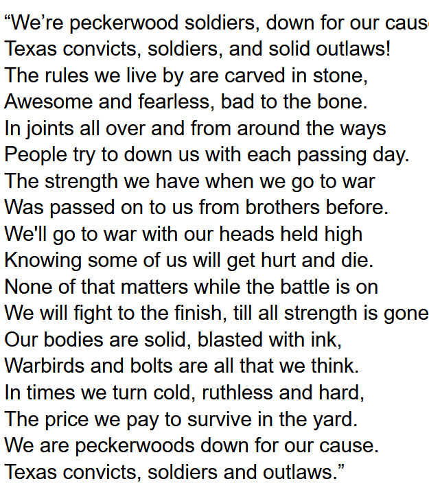 This long poem is from a member of the Aryan Circle, a large and dangerous Texas-based prison gang. Given the refrain, this may be a song, sung to the tune of "A Country Boy Can Survive," but I haven't tried to sing it.