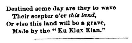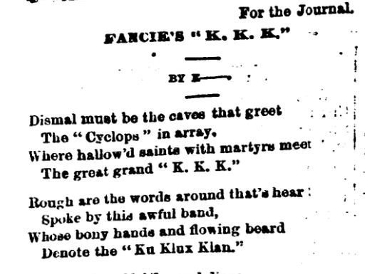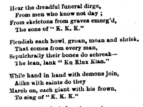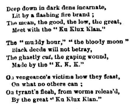 Here's an ancient one--an original Ku Klux Klan poem from North Carolina in 1868.