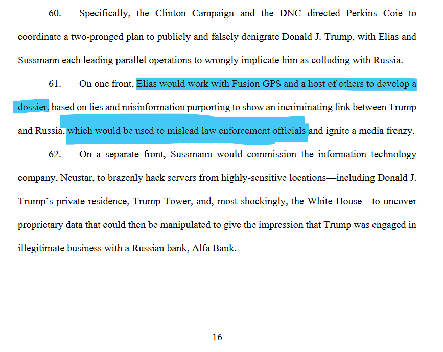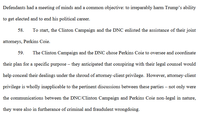 Hillary & her team sued Perkins Coie's lawyers to hide their crimes behind attorney client privilege while one lawyer, Elias, lead the oppo research effort to smear Trump & the other lawyer, Sussmann, lead the effort to fake evidence to add to the narrative.