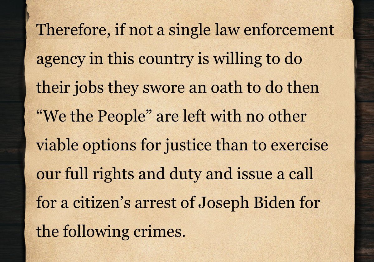 The group’s website calls for “a citizen’s arrest of Joseph Biden” for “crimes” because “not a law enforcement agency in this country is willing to do their jobs.”