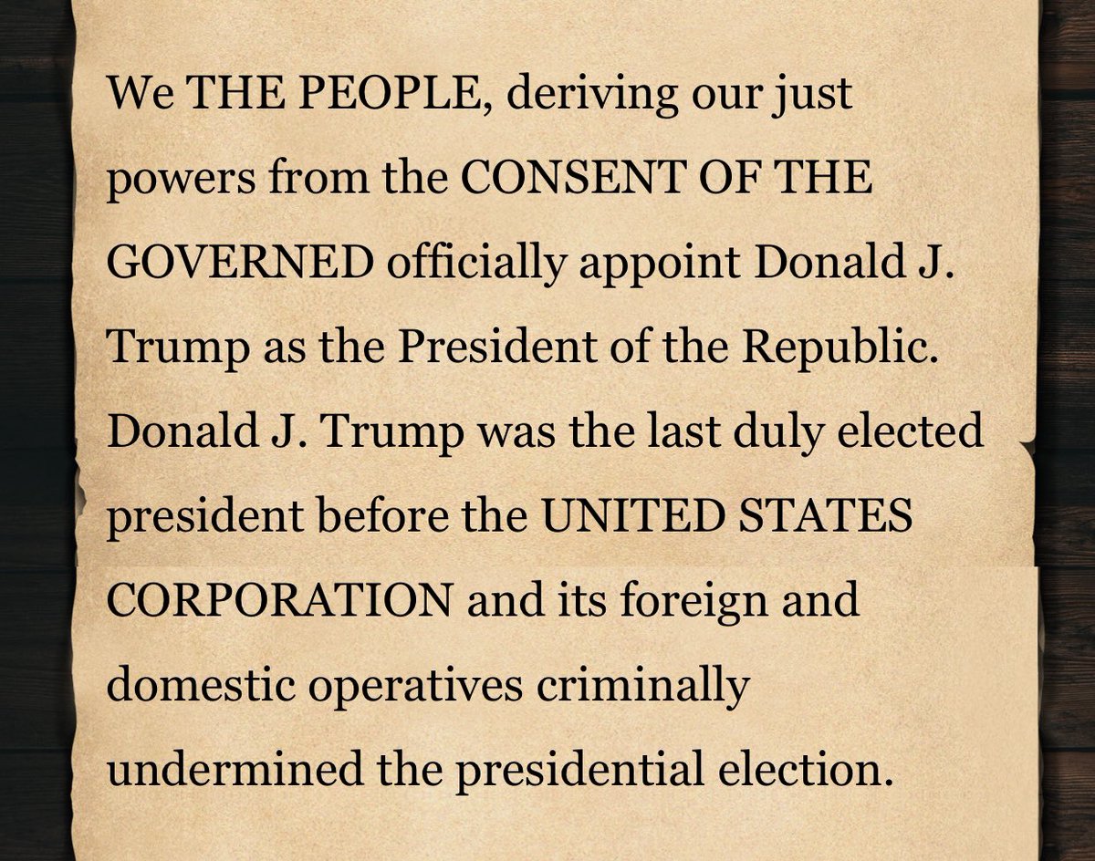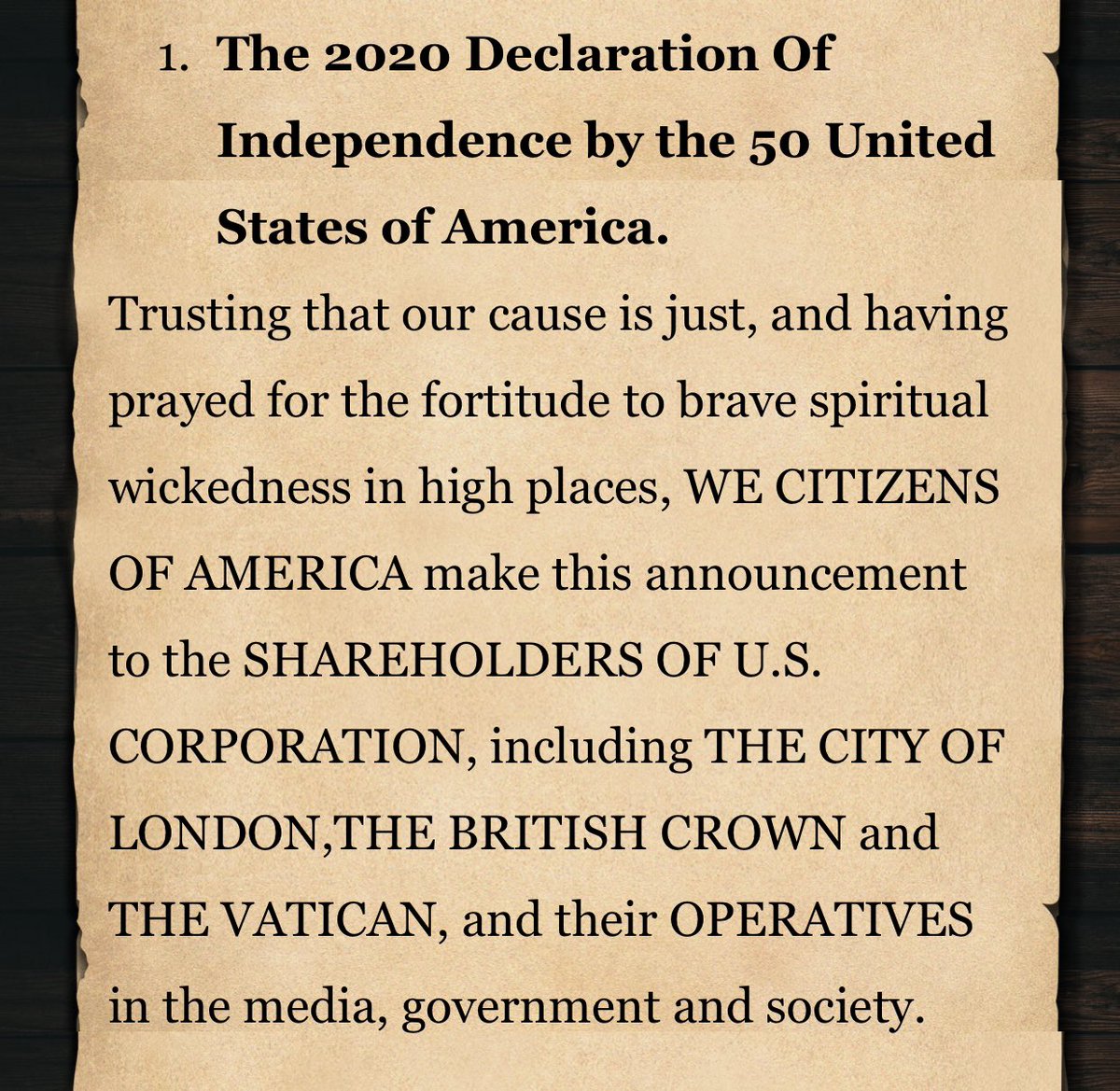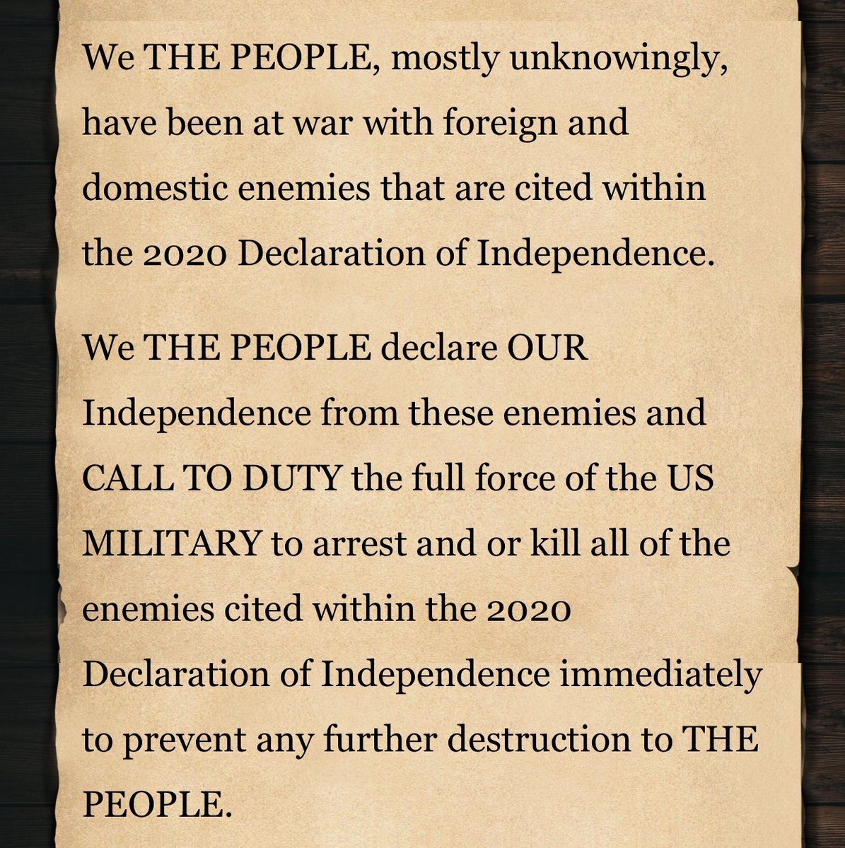 The group’s “Declaration of Independence 2020” document calls for law enforcement or the military to hand Joe Biden over to them or to publicly broadcast the arrest through the media.