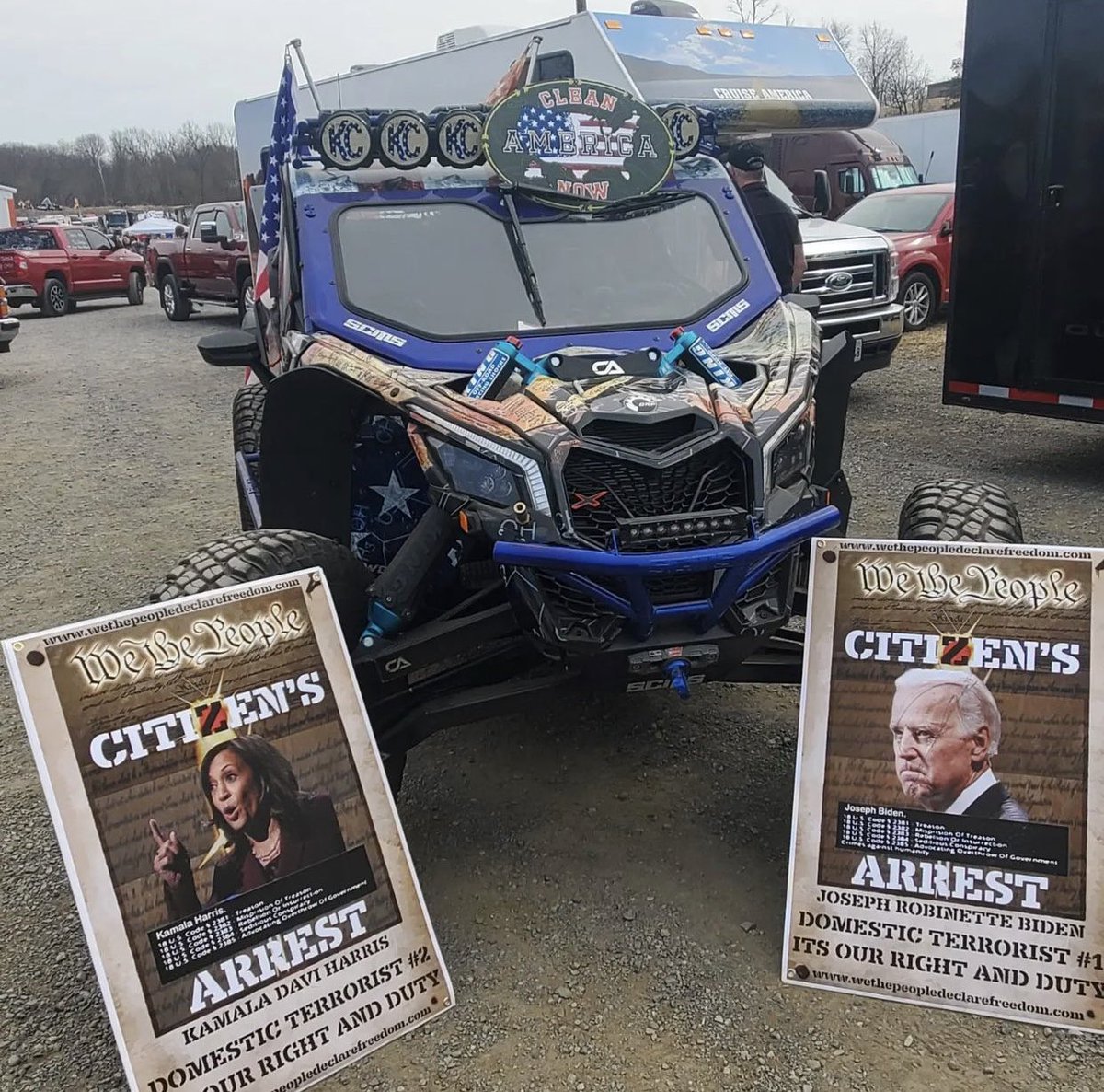Wanted posters for Joe Biden and Kamala Harris put up by the PBI QAnon group at the People’s Convoy near DC.