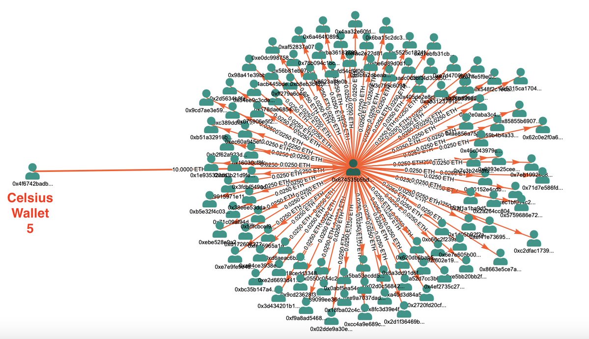 Receive small #Ether transfers from #Celsius Wallet 5, then distribute the #Ether to dozens of downstream wallets. (2/n)
