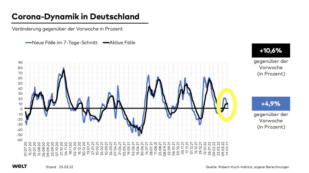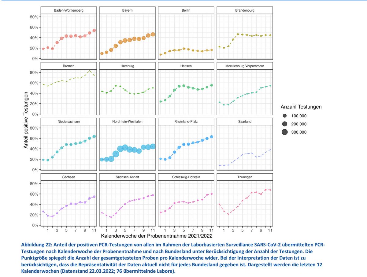 In Sachsen und Thüringen ist nicht zuletzt ein Nachholeffekt zu vermuten, denn an diesen beiden Ländern ist die erste Omikronwelle halbwegs vorübergegangen.
