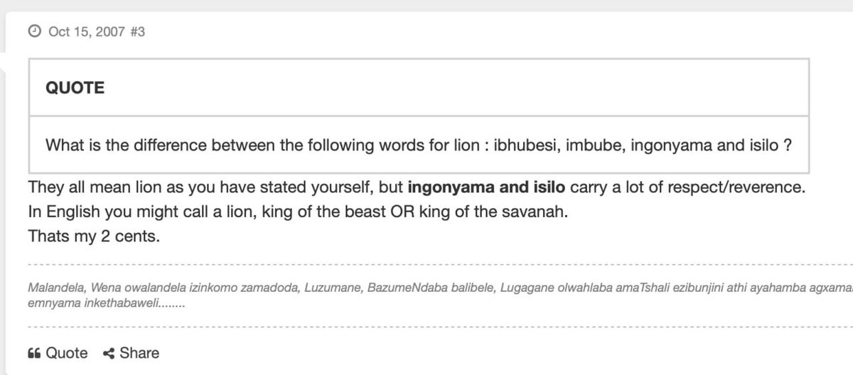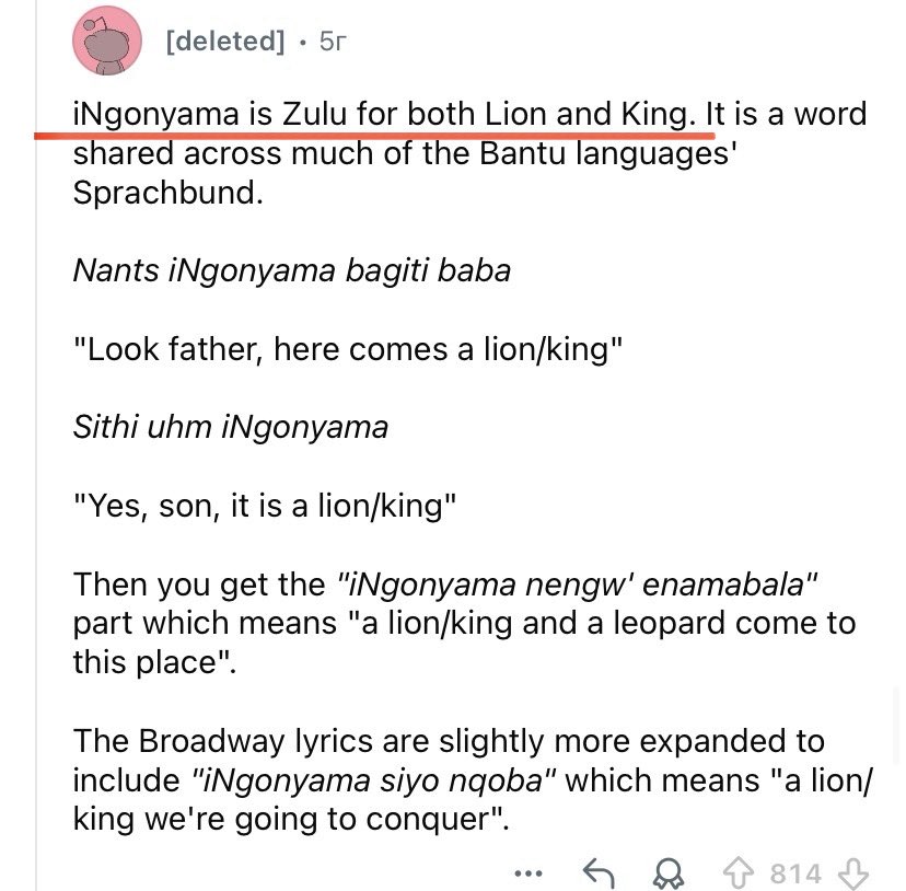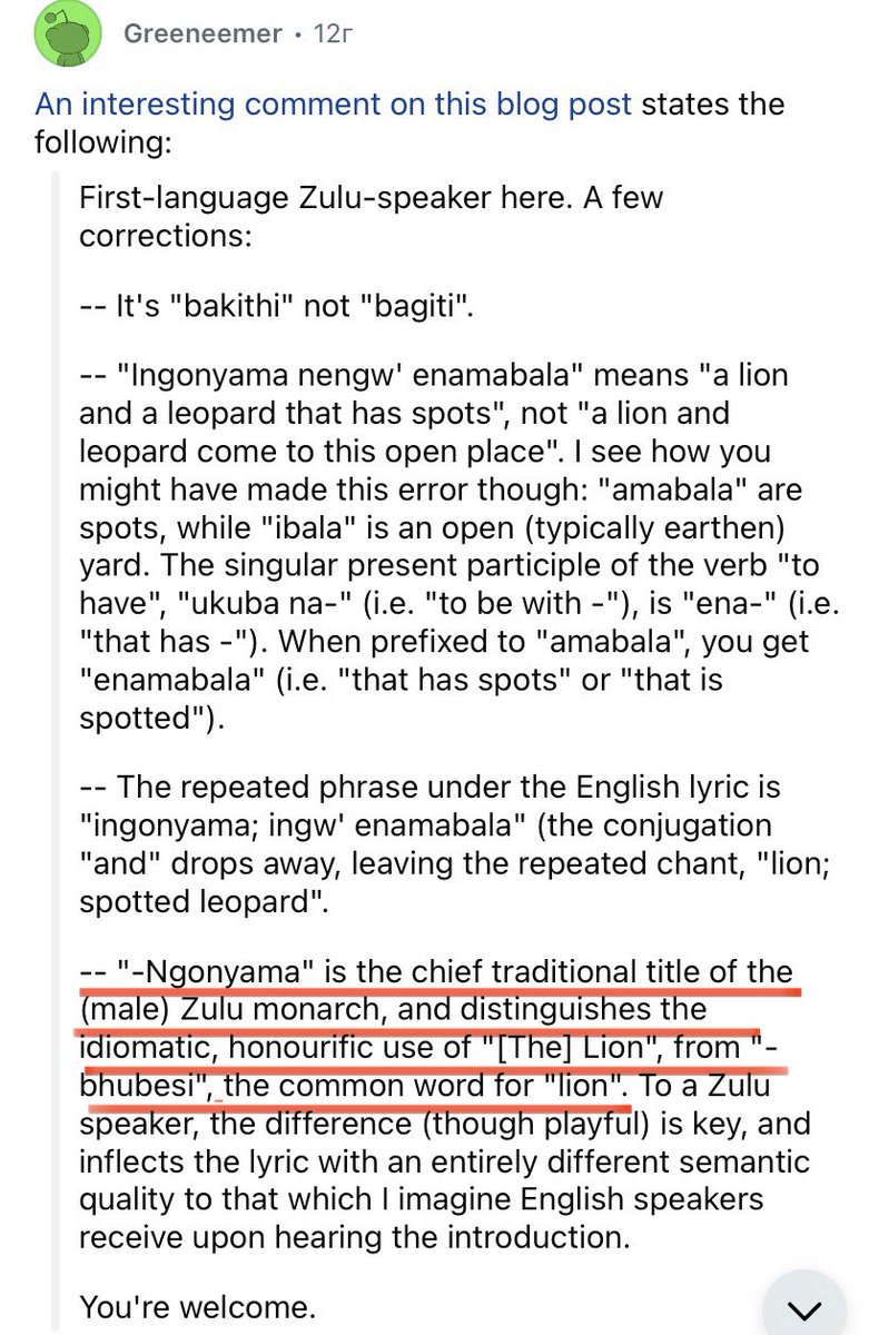 Но она есть, в версии комика — удивление перед львом, в реальности — исполненный трепета диалог сына с отцом. ingonyama — это почтительное слово для льва (в отличие от бытового ibhubesi) + титул зулусских правителей: КОРОЛЬ/ЛЕВ.