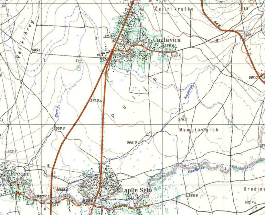 Na gornjoj slici vidimo primjer ove pojave južno od srpskih sela Laplje Selo i Preoce. Na isječku topografske karte na ovoj slici vidimo stanje na istom području 1984.